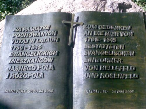 Na jednym z protestanckich cmentarzy, a dokładnie na cmentarzu w Jasnym Polu (który był też cmentarzem sąsiadujęcej wsi Różopole) została wmurowana w maju 2008 tablica pamiątkowa w obu językach. Wspólna ceremonia polskiego protestanckiego pastora z kościoła w Ostrowie oraz katolickiego księdza z Kobierna z udziałem gości z Niemiec (członków Koła Przyjaciół Powiatu Krotoszyn), polityków z regionu, mieszkańców okolicznych wiosek oraz kilku polskich członków ze stowarzyszenia Przyjaciół Powiatu Koźmian-Bellheim, było udanym uwieńczeniem 2-letniego projektu, który mogłem przeprowadzić tylko dzięki pomocy wielu osób, zarówno ze strony polskiej jak i niemieckiej, w zasługującej podkreślenia przyjaznej armosferze.
